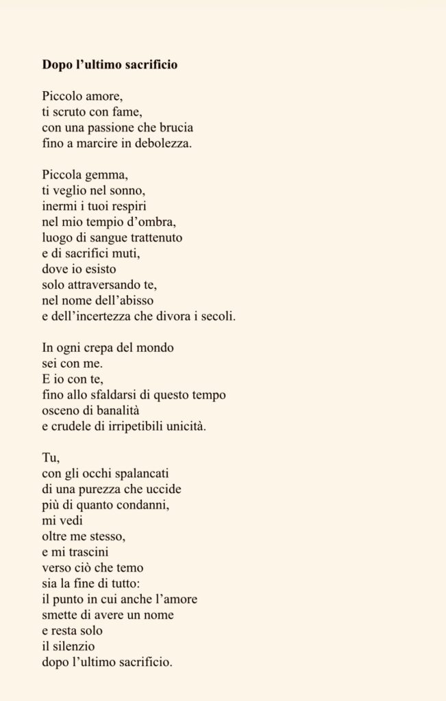 L’opera premiata, “Dopo l’ultimo sacrificio”, ancora inedita al momento della partecipazione, si presenta come una lirica densa di tensione emotiva e profondità espressiva. Al centro del testo emerge una promessa d’amore dal tono malinconico, quasi frantumato, che si inserisce con coerenza nella poetica dell’autore: una scrittura capace di esplorare la fragilità dei sentimenti senza rinunciare a una forte identità stilistica.